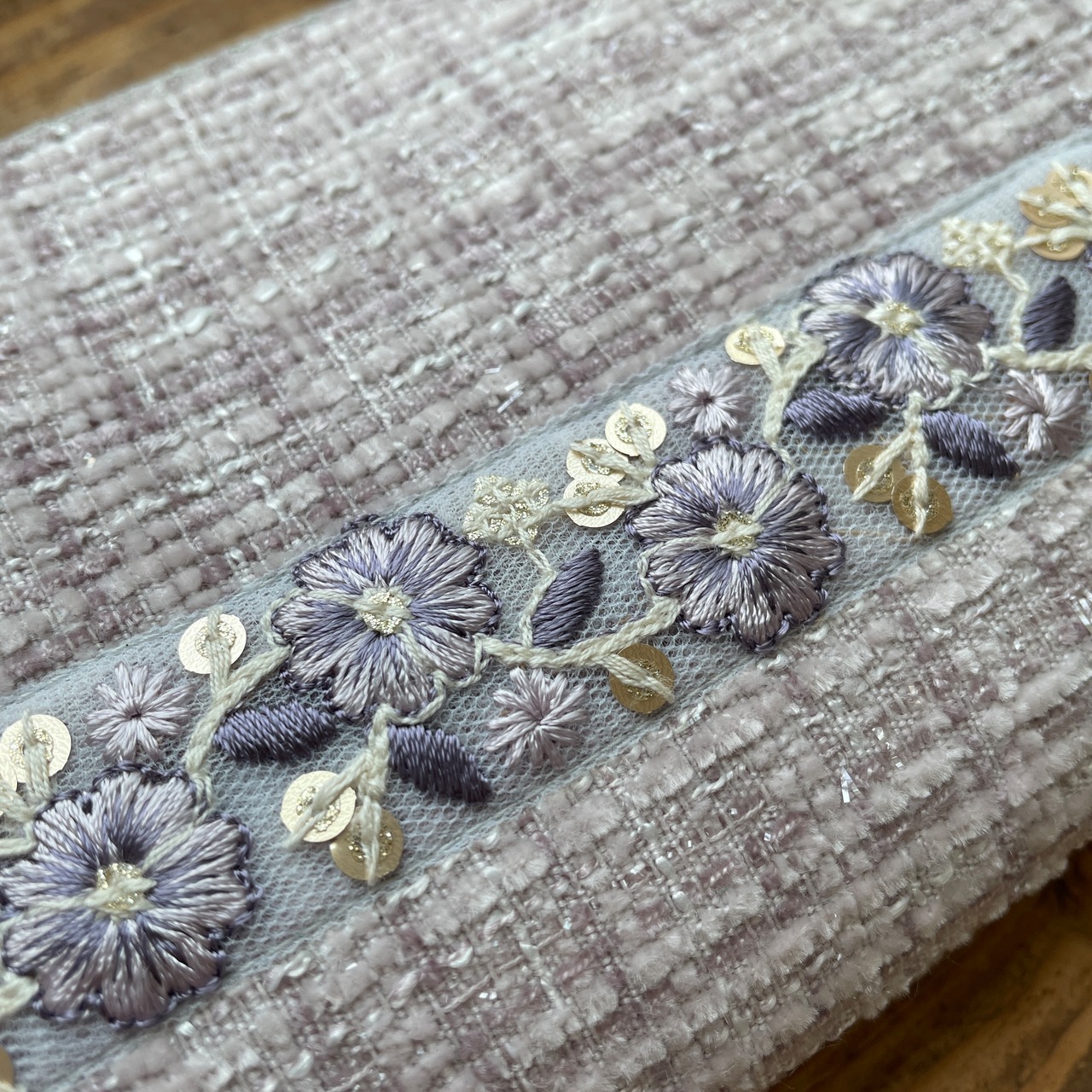 可愛らしいパープル系ワントーンの花柄の刺繍リボンは、落ち着きのある印象です。