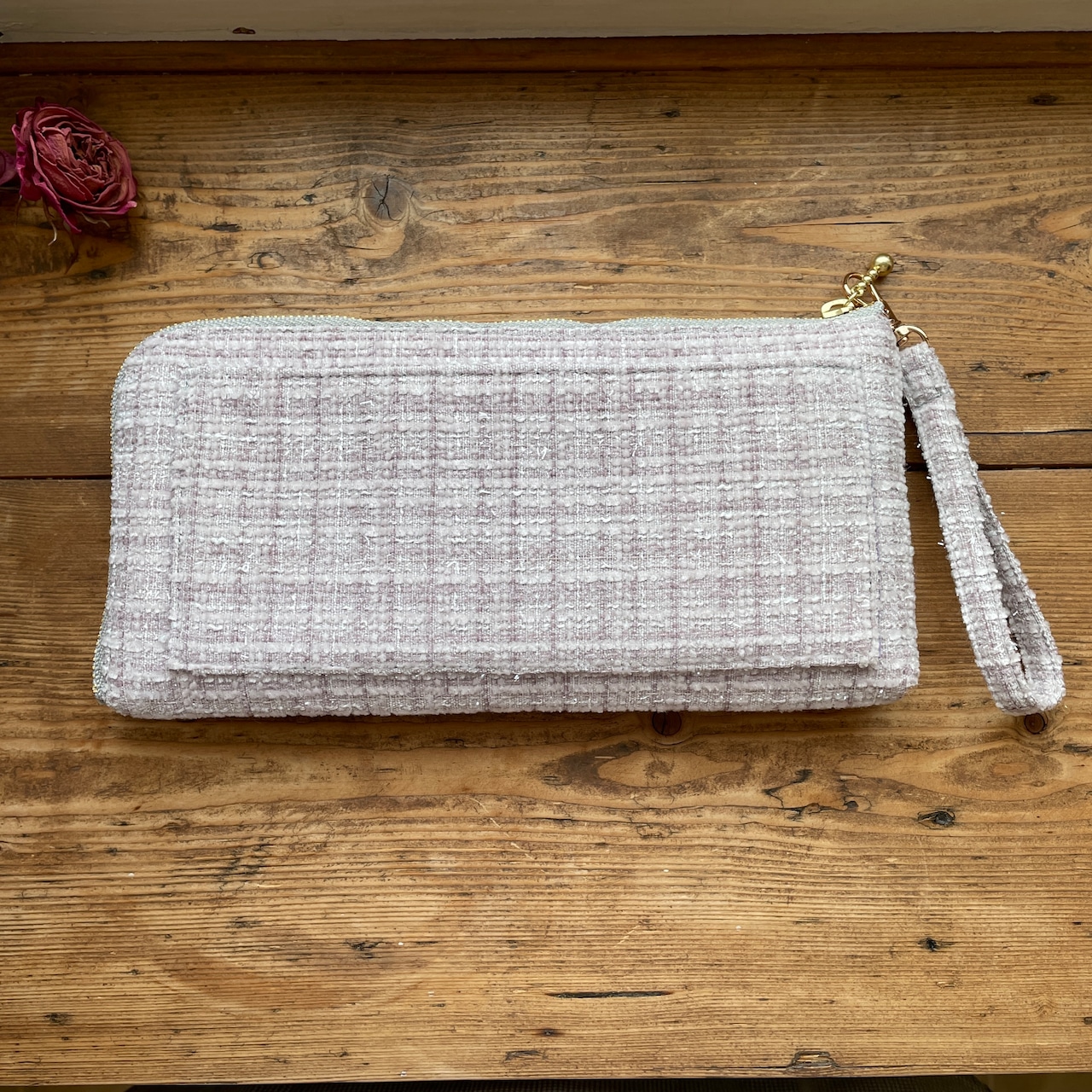 優しい色味のインド刺繍リボンとピンクベージュ系のツイード生地を使用して、長財布を作りました。