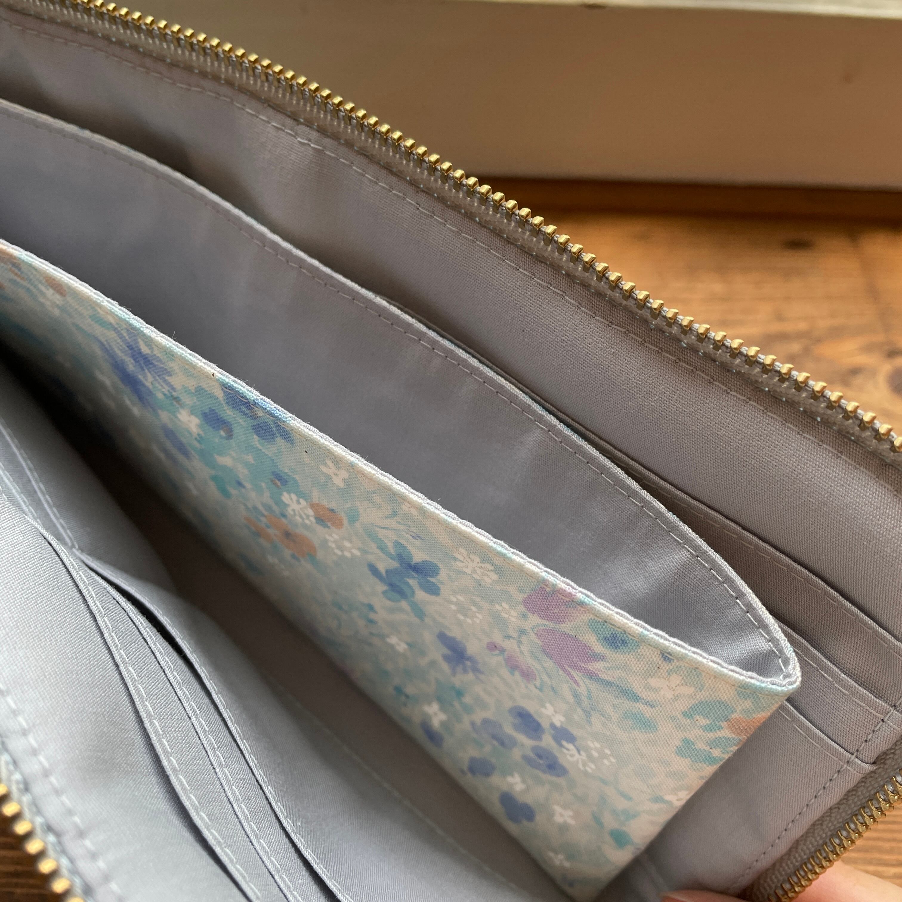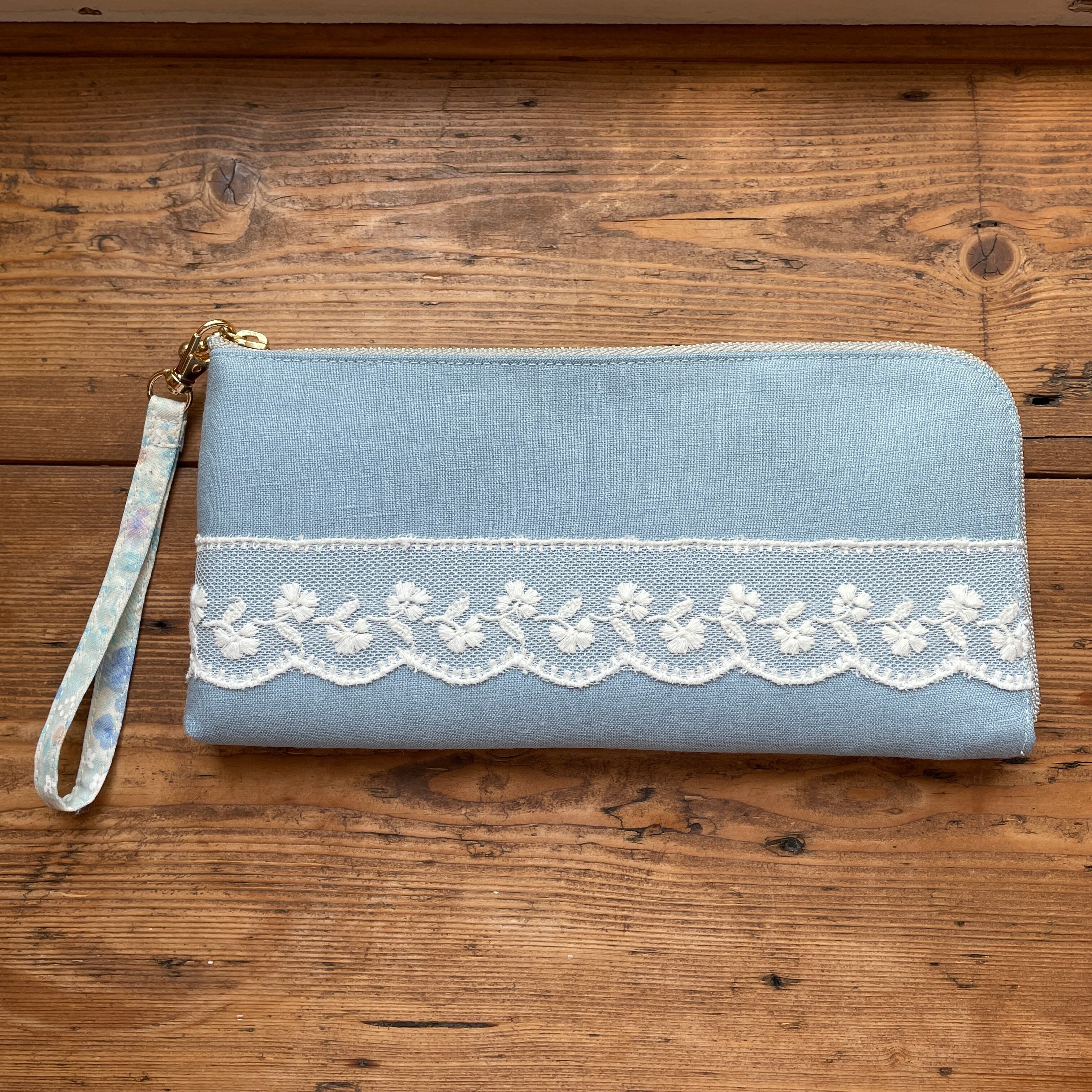爽やかな水色のリネン生地と繊細なレースで長財布を作りました。