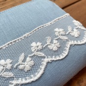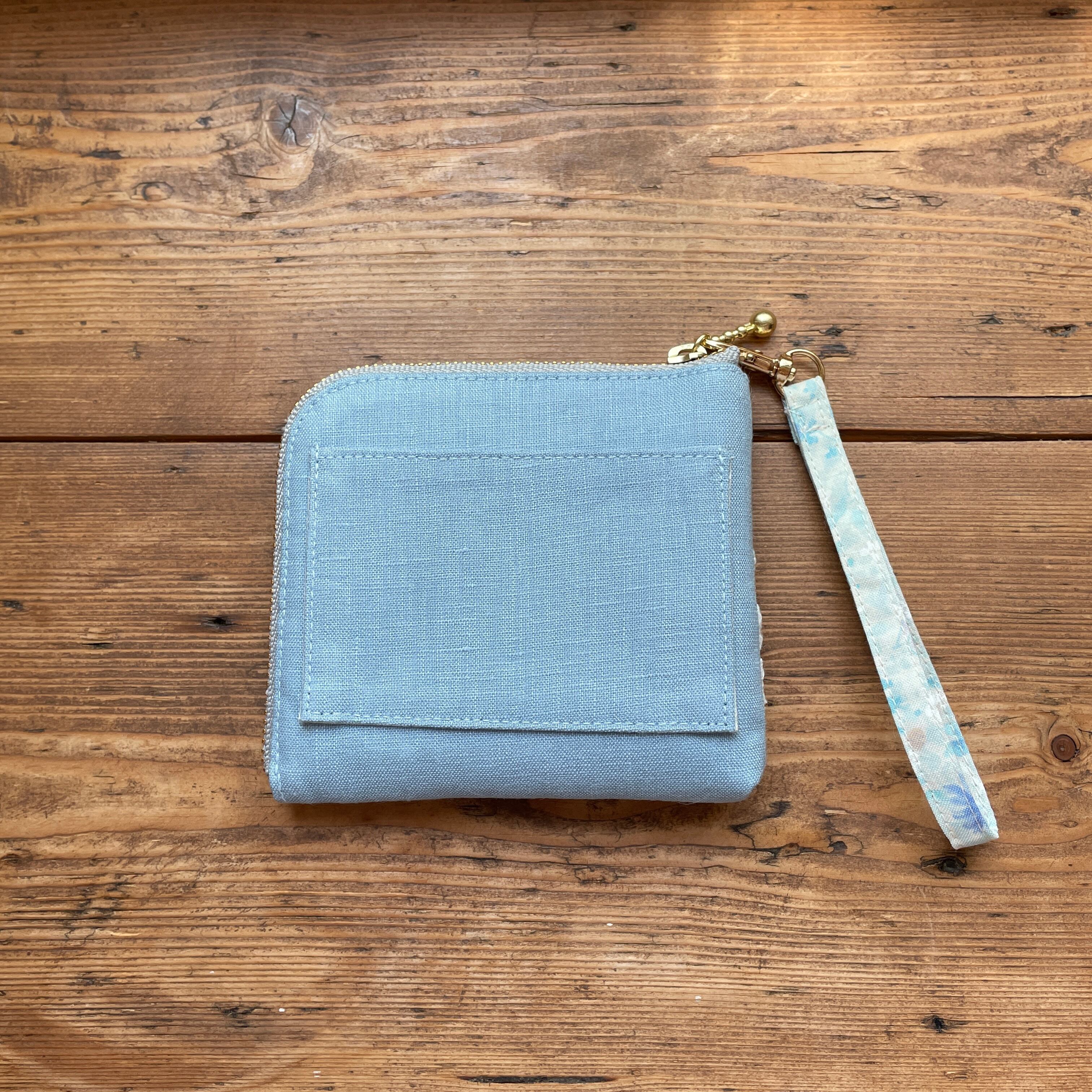 爽やかな水色のリネン生地と繊細なレースでコンパクト財布を作りました。