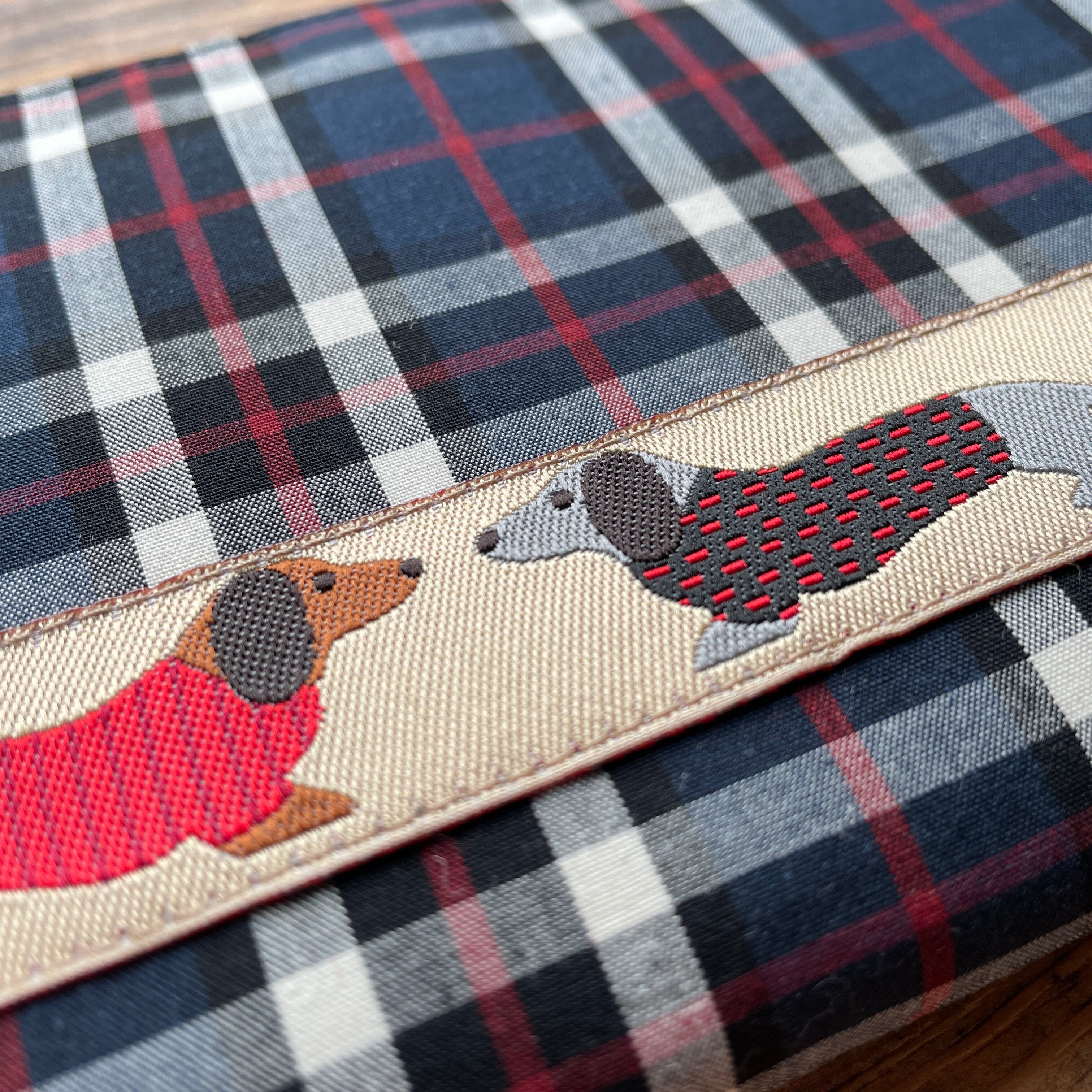 トラディショナルなチェック柄とダックス柄のリボンを組み合わせて、長財布を作りました。