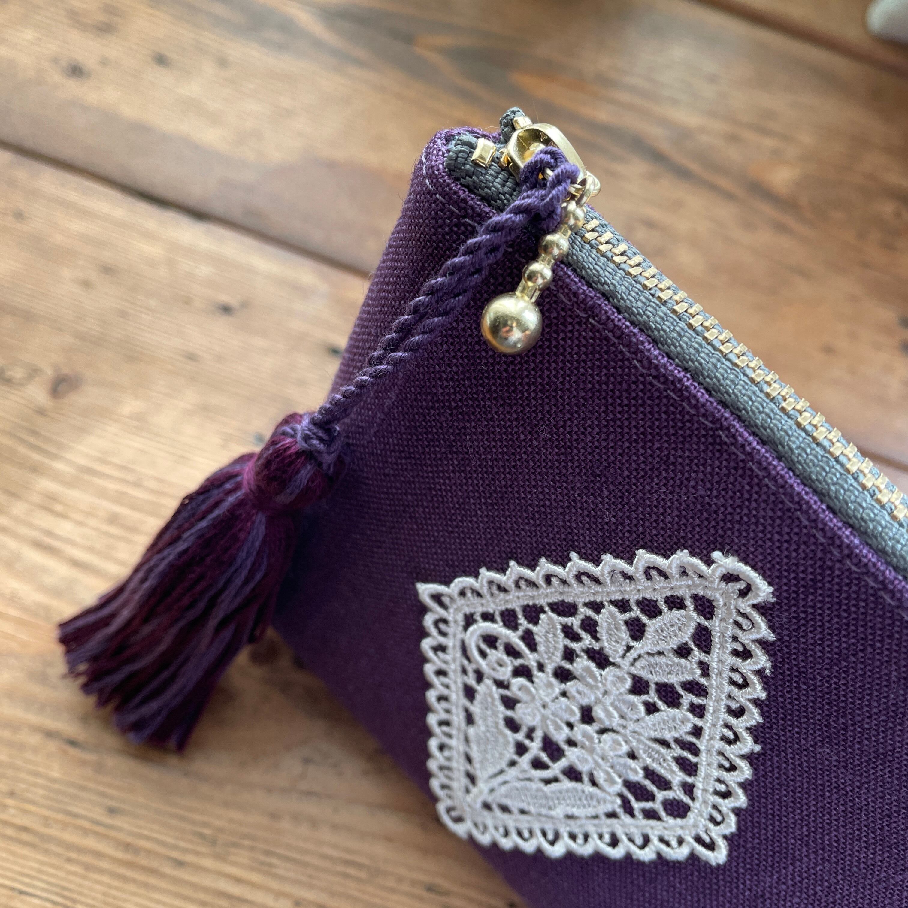 リネンとレースモチーフの長財布(濃パープル)