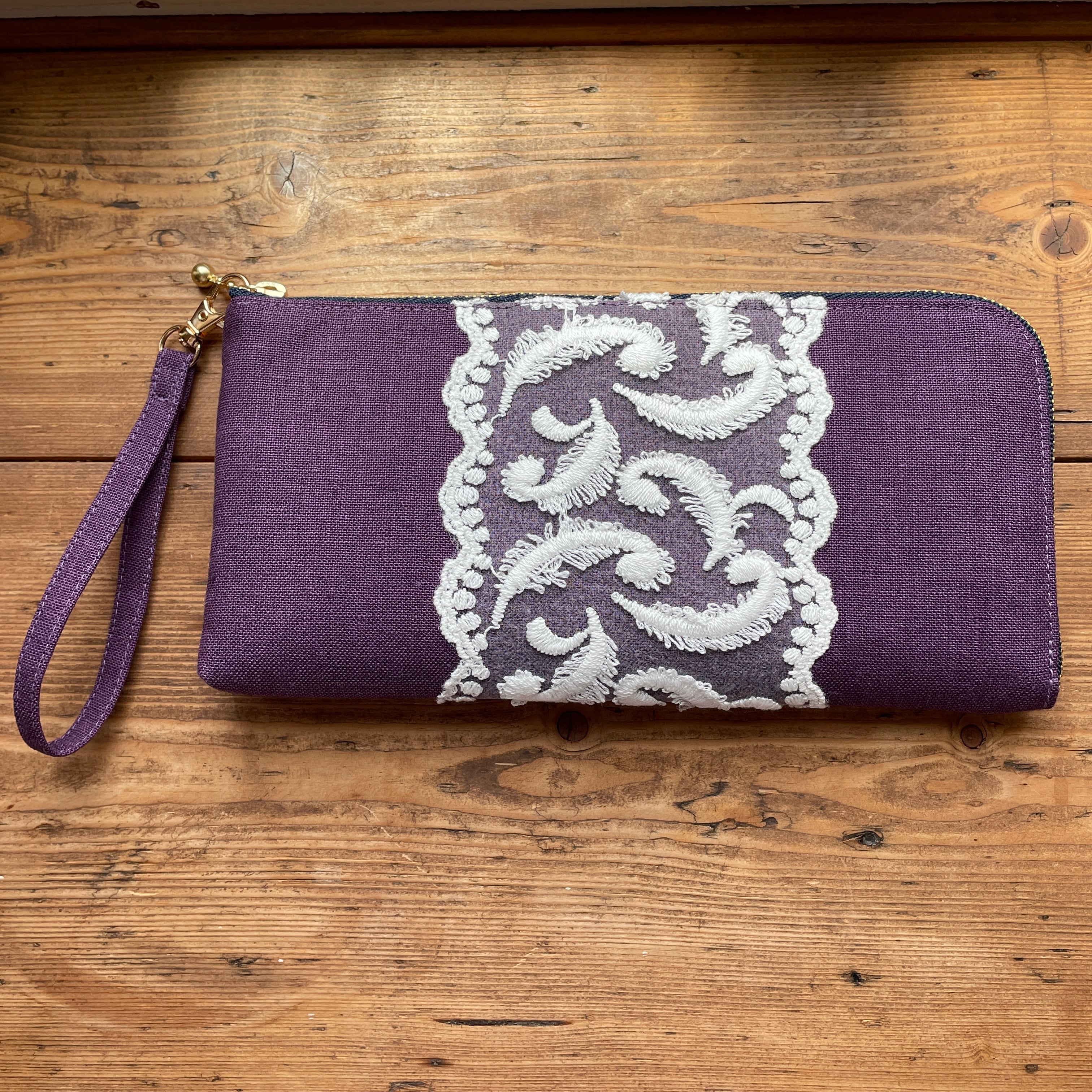 落ち着いた色味のリネンと繊細な羽モチーフの幅広レースで長財布を作りました。