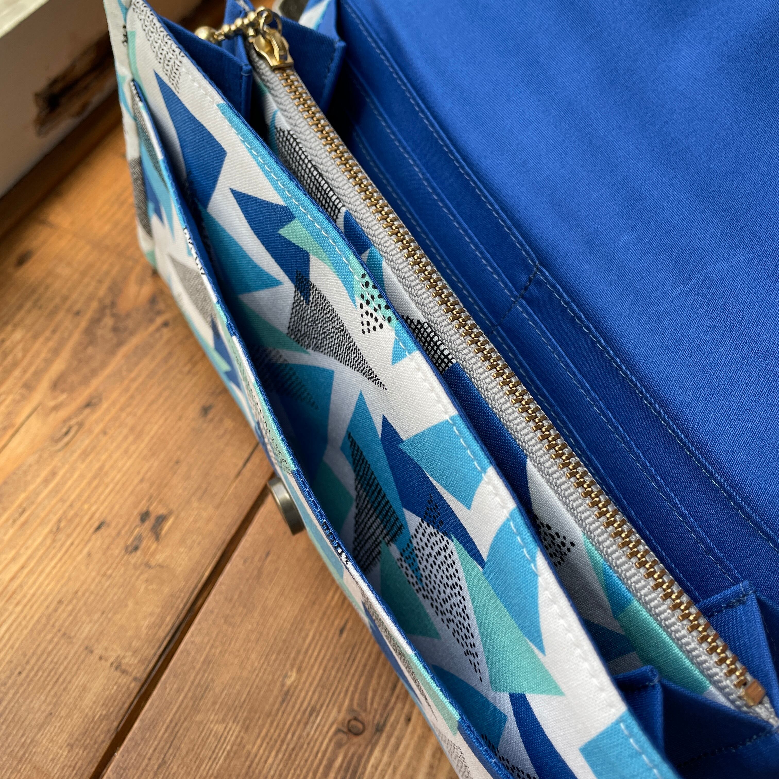 ブルー系のランダムに重なった三角形がポップなイメージのお財布ショルダーです。