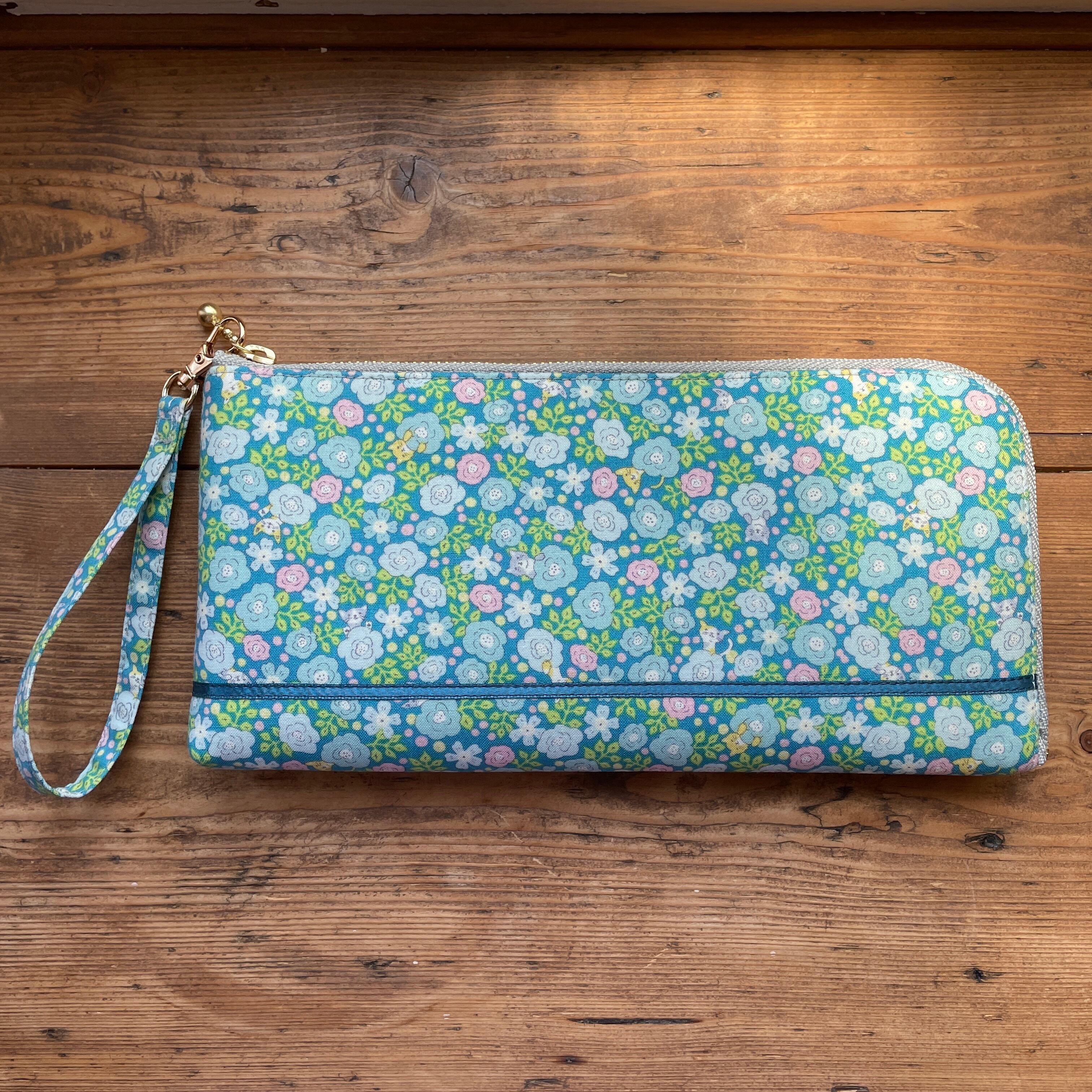 小さな花の間にちょこんと猫たちが顔を覗かせる。隠れた遊び心の可愛いプリント生地で長財布を作りました。